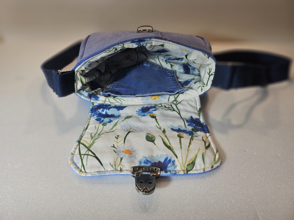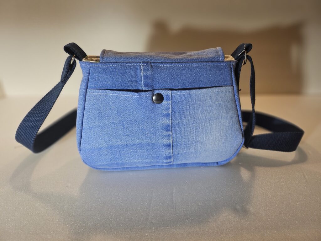 Sac bandoulière en Jeans Fabrication : cotonLes modèles présentés peuvent être réalisés dans les coloris et les motifs de votre choix. Poches à l’arrière et à l’intérieur du sac. Sangle réglable. Dimensions :L. 22cm X l. 17cm X H. 08cm 15 € l’unité Suggestion de présentation.