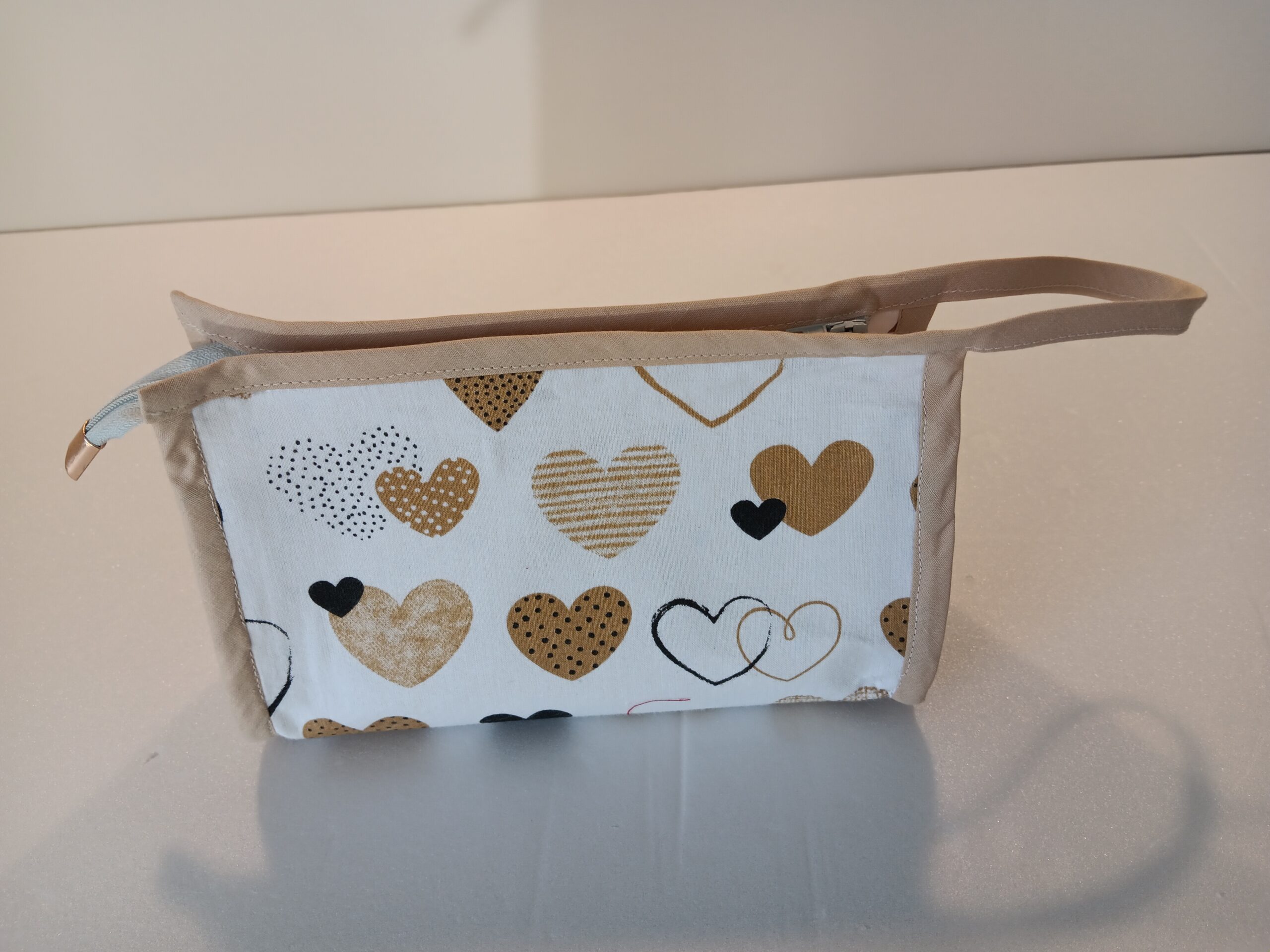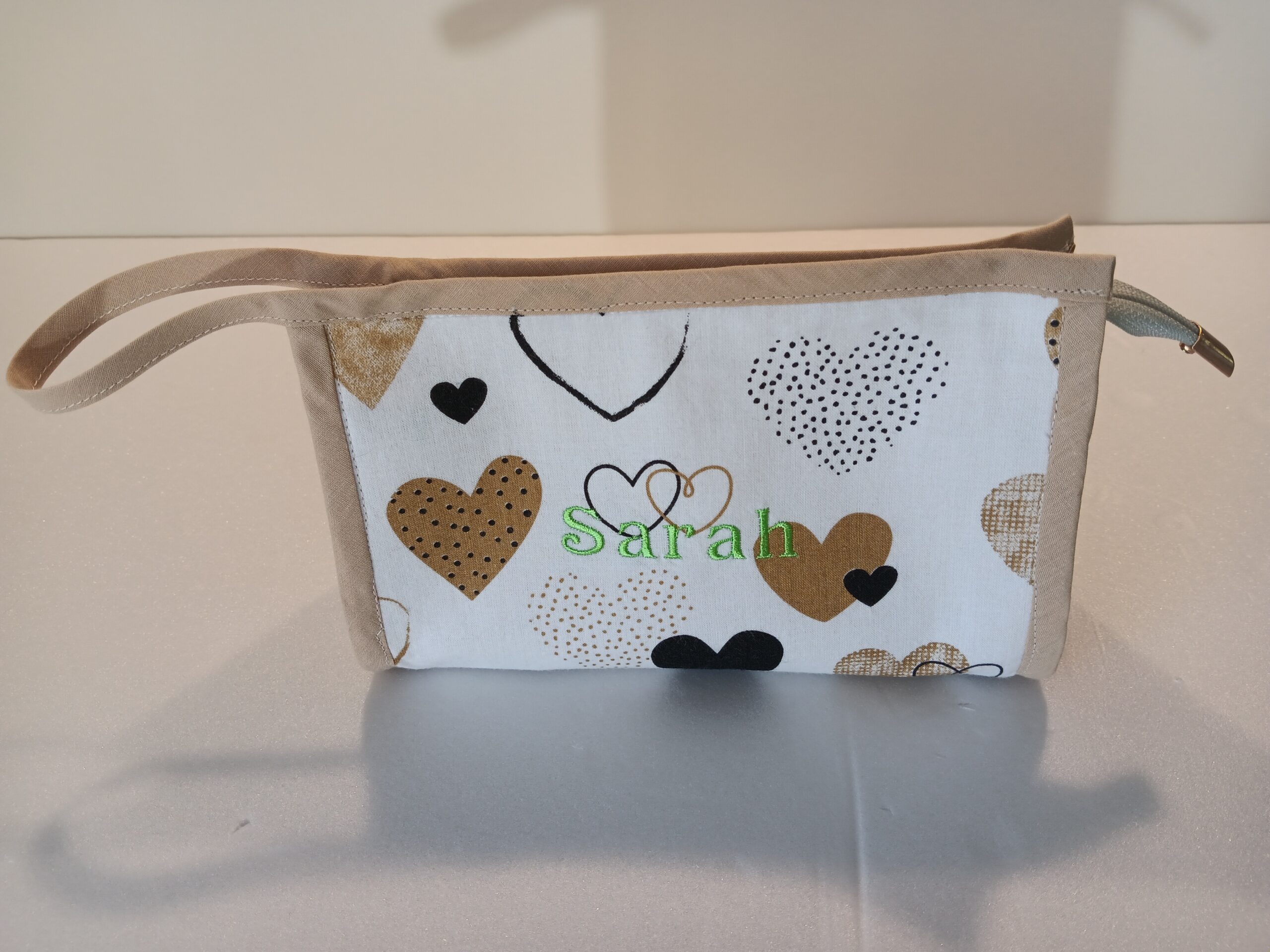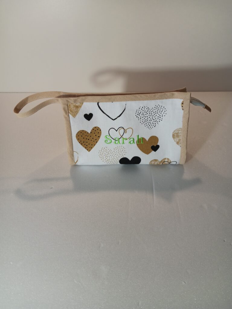 Trousse brodée Fabrication : coton.Les modèles présentés peuvent être réalisés dans les tissus et coloris de votre choix tout comme la broderie. Dimensions : L. 20cm X H. 12cm X l. 7cm 6€ l’unité. Suggestion de présentation.